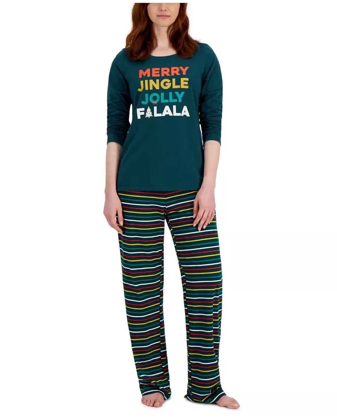 Family PJs Women's 2-Piece Pajama Set Green Merry Christmas Stripes